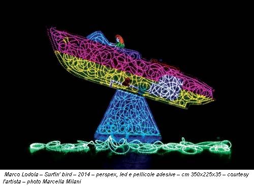 Altra nota di valore la presenza sparsa di blu e rossi accesi, incursioni a vocazione pop tutt’altro che marginali se a spalleggiare il lavoro della fotografa texana è lo spirito indefessamente pop di Lodola. Potete amarlo o odiarlo, tanto l’artista della bassa padana rimane fedele a sé stesso, l’uomo che dall’innesto tra pop art e fauvismo ha fatto nascere un idioma visivo tutto suo, subito riconoscibile e adatto a tutte le età. Un creativo a garanzia di presa sul pubblico, specie quando il suo mondo scultoreo, plasticoso e colorato s’illumina di tubi led aggrovigliati, farcia – o più poeticamente anima – per un grosso involucro di perspex sagomato a forma di futuribile scafo. Surfin’ bird è cento per cento Lodola, simpatico e delizioso nei coloratissimi dettagli adesivi simili ai vecchi “trasferelli”, mentre raffreddano ogni velleità giocosa – e creano il giusto contrasto – i componenti cromati come il bocchettone del carburante, preso pari pari dalla produzione di serie. Operazione contemporanea e avveniristica per un Lodola qui particolarmente capace secondo Quaroni nel «dare realtà ad un’idea». E, aggiungiamo noi, piazzarci di fronte un futuro dinamico e colorato, che non guasta mai.