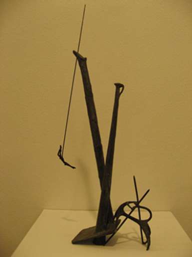 Il senso di asimmetria sbilanciata, di peso che si fa insopportabile, di polarità difficilmente ma testardamente conciliabili raggiunge l’estremo nell’opera che occupa tutta la parete di fondo della prima sala. A una struttura irregolare fissata al muro sono attaccate da una parte una delle forme cave appena descritte, dall’altra un’asta spessa e curva, a cui sta a sua volta attaccata un’asta molto più fine. Che si muove impercettibilmente, come la lancetta di un orologio scarico, seguendo gli spostamenti d’aria causati dalle persone in moto nella sala. Segnando così il proprio scorrere del tempo, irregolare e personalissimo.