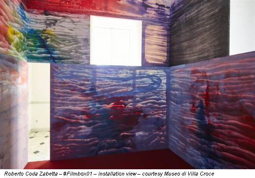 L’ingresso è una scommessa, o pura selezione naturale. Sei un po’ troppo oversize? Non entri. Un anfratto di quaranta, massimo cinquanta centimetri di apertura. Non saranno pochi per garantire accesso a tutti, tenendo conto che #Filmbox01 non ha ragion d’essere se guardato solo dall’esterno? Ché l’operazione poi è godibile e tutt’altro che buttata lì, quasi calata in un’idealizzazione estetica pieno cinque-seicentesca. Pensate a quando la meraviglia non era un concetto scontato, e un pellegrino passando tra i vicoli pre-Via della Conciliazione si trovava d’emblée a gestire la fascinazione totale di San Pietro; o – sempre in zona Vaticano – al contrasto/rapporto tra esterno e interno di una struttura come la Cappella Sistina. Probabile che Coda Zabetta non aspiri ad emulare gli attivisti della Fabbrica di San Pietro, e nemmeno i vari Michelangelo, Botticelli, Perugino e compagnia bella della Sistina; tuttavia nel suo piccolo è riuscito a ricreare quella meravigliosa sensazione di stupore pienamente estetico che l’arte contemporanea – e più che altro l’astrattismo – ha un po’ perso. È quella sensazione che s’innesca vedendo dall’esterno la scatola e, dopo averle girato attorno, si conclude all’interno, quando la pittura è totale e introduce ad un estetismo da vivere, ma nemmeno poi troppo fine a sé stesso. Presunzione d’intento è infatti la volontà di costruire una struttura che rappresenti un trattato sull’astrattismo e sulla capacità di giocare coi toni, con le variazioni di densità, con gli effetti del dripping e le violente secchiate di pittura che sembrano distogliere dall’andamento lineare, così sofficemente onirico, su cui l’artista piemontese tiene duro dall’inizio alla fine. Bombardamento pittorico, un attacco che trova la sua quadratura nella violenza di alcuni stacchi cromatici bilanciata dal chiarore evanescente cui unitariamente tendono le sommità delle quattro pareti, perfettamente raccordato agli stucchi bianchi del soffitto.