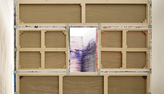 Tanto per non rimanere sul vago va stabilito anzitutto in cosa consiste #Filmbox01: è una casetta senza tetto con moquette rossa e quattro pareti tutte pittoriche, composte da tele unite su tre livelli mediante piastre metalliche avvitate, con su ogni lato una finestra. Pittura all’interno, fuori telai a vista con contorno di colature perimetrali. Solida più di quanto l’aspetto non dia ad intendere, questa struttura è una matriosca infilata in una saletta non molto più grande di lei, creando stretti corridoi che complicano l’operazione di girarci attorno per cercare l’ingresso. Quest’ultimo, una volta trovato, non dà automaticamente la soluzione, anzi. Al varco c’è quel “per molti ma non per tutti” rimasto in sospeso.