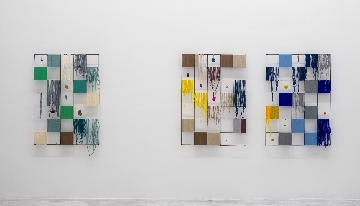 Nello spazio white cube della Michel Rein assistiamo così all’epifania di questa stratificazione: a terra una installazione con i libri di mattoni cotti che Ciacciofera in passato aveva dedicato alla sua maestra Maria Lai, ma che poi sono diventati così caratteristici del suo lavoro, di grande potenza evocativa e poetica, in cui l’artista italiano, residente a Parigi, reinventa una lingua in cui il significante prevale sul significato, l’estetica sul contenuto; sui muri invece Janas Code sono griglie di ferro, quasi ascisse e ordinate su cui si incontrano, tra pieni e vuoti, oggetti e tessuti, i punti della vita dell’artista con le rette incrociate della storia dell’universo e dell’umanità: “La loro configurazione spaziale – scrive ancora la Gvero – che alterna spazi vuoti e pieni, invita lo sguardo del visitatore a percorrere la superficie dell’opera, attraversandola verticalmente o orizzontalmente partendo da diversi punti di vista, definendo il ritmo di lettura di queste realizzazioni dalla natura profondamente polisemica, in cui segni appartenenti a civiltà, epoche e culture temporalmente e geograficamente distanti coabitano. Ai fili di tessuto, appartenenti alla tradizione manuale più ancestrale e ai reperti archeologici, come i trilobiti e ammoniti, i ciondoli medievali o frammenti e oggetti di epoche varie dal neolitico in poi, si affiancano reperti dell’epoca contemporanea”.