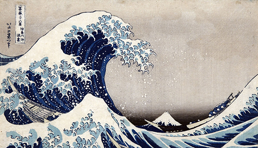 In alto: Katsushika Hokusai, La [grande] onda presso la costa di Kanagawa, dalla serie Trentasei vedute del monte Fuji, 1830-1832 circa. Silografia policroma. Kawasaki Isago no Sato Museum