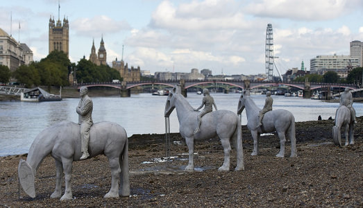 Quattro uomini a cavallo emergono silenziosamente due volte al giorno dalle acque del Tamigi, nei pressi del ponte Vauxhall, a meno di un miglio dal Parlamento. È la nuova provocazione di Jason deCaires Taylor, un commento politico all’impatto dei combustibili fossili sull’ambiente.
