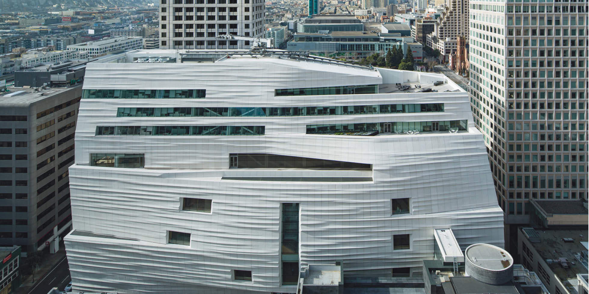 La visione dello spazio museale integrato allo spazio pubblico viene assunta anche nell’ampliamento del 2016 dello SFMOMA, opera dello studio norvegese Snøhetta, che risulta profondamente differente dal preesistente museo di Botta cui letteralmente aderisce. Il nucleo originale è geometrico, dai volumi netti quasi monumentale, l’addizione è invece sfuggente, imprendibile da un unico sguardo e ha mirato a realizzare un luogo di socializzazione, aperto e pubblico, terrazze con vista sulla città, un giardino verticale spazi di socializzazione a completare la riconversione e l’integrazione urbana dell’art district; differente per la scelta dei materiali, per le componenti cromatiche e soprattutto sul piano tecnologico, puntando su isolamento termico, impianti evoluti per il riscaldamento e raffrescamento, sistemi per la gestione intelligente dell’illuminazione e sistemi di recupero e riuso dell’acqua piovana. La raccolta del nuovo museo conta un patrimonio ormai di 33 mila opere di arte contemporanea e del dopoguerra comprendendo anche le mille e più della collezione Fisher prestate nel 2016 per la nuova ala (ironicamente definita Museo Fisher) con un accordo della durata di cento anni: raccolta cospicua per ciascuno degli artisti americani come Alexander Calder, Chuck Close, Willem de Kooning, Arshile Gorky, Jasper Johns, Roy Lichtenstein, Barnett Newman, Jackson Pollock, Mark Rothko, Robert Rauschenberg, Frank Stella, Clyfford Still, Cy Twombly, Andy Warhol, dei californiani John Baldessari e Ed Ruscha e anche di artisti internazionali.