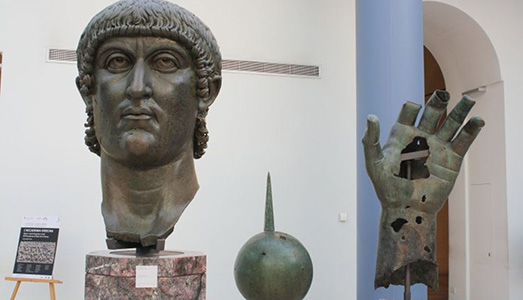 I frammenti della statua bronzea dell’imperatore Costantino, alta 12 metri e risalente al IV secolo, sono tra i più preziosi della collezione romana e includono una testa enorme, una sfera, un avambraccio sinistro e una mano, a cui manca il palmo (che conteneva la sfera), una parte del medio e la maggior parte del dito indice. Appunto.
