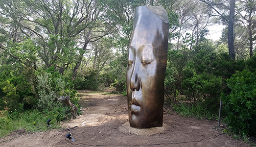 Ritroviamo qui esposti anche fotografi come Massimo Berruti e Davide Monteleone, vincitori del noto Prix Carmignac du Photojournalisme, creato nel 2009, che supporta ogni anno un reportage di investigazione nel mondo. Una villa con vista sul mare comprata cinque anni fa da Edouard Carmignac, fondatore e Ceo della società Carmignac, dalla famiglia dell’architetto Henry Vidal che, da vecchia fattoria immortalata nel film Pierrot et le fou di Jean-Luc Godard, l’ha trasformata in una magione che ha visto passare negli anni il gotha internazionale dell’imprenditoria. Immersa in un demanio forestale protetto, il luogo espositivo di 2mila metri quadrati presenta due piani, di cui uno è stato realizzato sotto la villa stessa, prendendo la forma di una croce. Si tratta di uno spazio modulabile che al centro trova un soffitto d’acqua ottenuto grazie ad una lastra di PMMA, un plexiglass molto più resistente ma trasparente come il vetro, che trasmette infatti fino al 93 per cento della luce visibile. Questo elemento naturale che cade dall’alto, viene assorbito da quattro pareti blu che circoscrivono lo spazio centrale, per disperdersi poi intorno. Le sale adiacenti, che sono illuminate da una luce artificiale che cambia con le ore del giorno, accolgono opere che godono di un ampio spazio che ne facilita la fruizione. Un tocco di sacralità è dato dall’obbligo di percorrere scalzi la visita, e toccare il suolo frastagliato in grès che ne modella i passi. Lungo la mostra troviamo cinque opere di Roy Lichtenstein sulle sedici della collezione, Abstract Painting (2009) di Gerhard Ritcher sulle sei della collezione, ma anche il bellissimo Aerei (1989) di Alighiero Boetti. Ci sono creazioni in situ come No yet Titled (2018) di Miquel Barceló che vede un fondo marino animato da forme antropomorfe e monocellulari, che si dispiega lungo tre pareti, o One Hundred Fish Fountain (2006) di Bruce Nauman, una scultura sonora che presenta pesci diversi sospesi che cacciano acqua, entrambe isolate queste inducono alla contemplazione. Il giardino accoglie opere come Sea of desire di Ed Ruscha, i tre alchimisti di Plensa, le quattro stagioni di Rondinone o Path of emotion, un labirinto di specchi del danese Jeppe Hein, mentre ad accogliere il pubblico all’ingresso è Alycastre (2018), un enorme bronzo di Barceló che si ispira a un leggendario drago dell’isola. Nei giardini troviamo anche lo street artist Alexandre Farto Aka Vhils con Scratching the surface Porquerolles creata su un vecchio capannone i cui muri sono rivestiti di una colorazione particolare affinché questi volti scolpiti si integrino perfettamente nel contesto, grazie alla collaborazione dello studio di architettura Gmaa. Questa prima mostra, che si chiude il 4 novembre, inaugura un sito che ha per ambizione di voler diventare luogo di creazione e di rappresentazioni multidisciplinari, inclusa la musica. Niente di sorprendente visto che il direttore Charles Carmignac faceva parte del noto gruppo musicale francese, Moriarty. (livia de leoni)