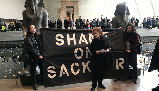 Sabato sera più di 100 attivisti si sono infiltrati nel famoso museo aprendo quattro stendardi rosso sangue sui corridoi, che riportavano scritto in lettere nere: “400.000 MORTI”, “VERGOGNA SU SACKLER”, “200 MORTI OGNI GIORNO” e “TAKE DOWN THEIR NAME”, mentre la folla di spettatori del museo alzavo lo sguardo verso la pioggia di “prescrizioni” del farmaco in carta bianca.