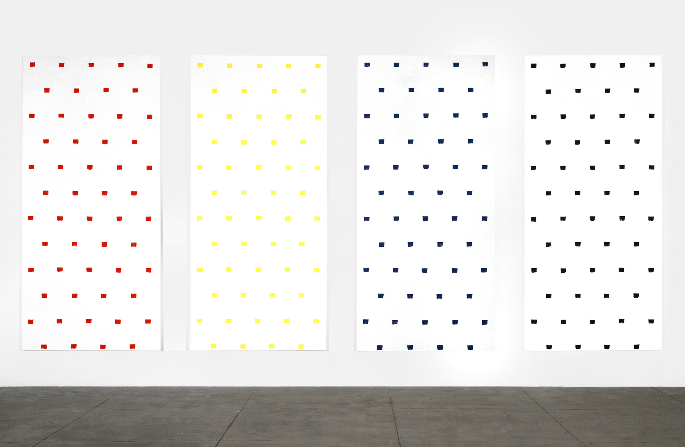 Terminiamo con Niele Toroni che, secondo una metodologia sviluppata nel 1966, applica un tocco di pennello della larghezza di 5 centimetri a un intervallo regolare di 30 centimetri: ogni sua “impronta” è unica, secondo la quantità di pittura, il supporto utilizzato e il vigore del gesto. (Maria Sensi)