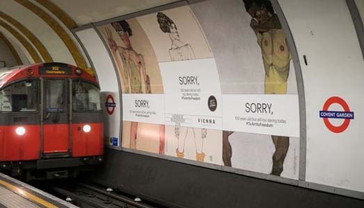 Nel 2018, si celebrerà il centenario dalla scomparsa del grande artista viennese, allievo di Gustav Klimt e morto a soli 28 anni per gli effetti dell’influenza spagnola. Così, l’Ente del Turismo della città austriaca si sta dando da fare per pubblicizzare gli eventi che animeranno musei e istituzioni e ha già dato il via a una massiccia campagna pubblicitaria in giro per l’Europa. Due manifesti, un autoritratto come Nudo maschile seduto e una Ragazza con calze arancioni, sono arrivati anche a Londra dove, però, hanno incontrato il veto della Società dei trasporti che gestisce la Tube. Cento anni fa, Schiele era avversato per lo stile crudo e asimmetrico, poi è diventato uno dei campioni dell’arte del Novecento e le sue opere sono conservate nei musei più importanti al mondo, oltre a comparire su t-shirt, mug e shopper. Ma alla Metropolitana di Londra la scelta deve essere sembrata troppo provocatoria. Comunque, l’Ente del Turismo non si è dato per vinto e ci ha riprovato, con un secondo invio. Questa volta hanno oscurato le parti intime e aggiunto la scritta SORRY, 100 years old but still daring today, ovvero, Siamo spiacenti, hanno cento anni sono ancora troppo audaci.