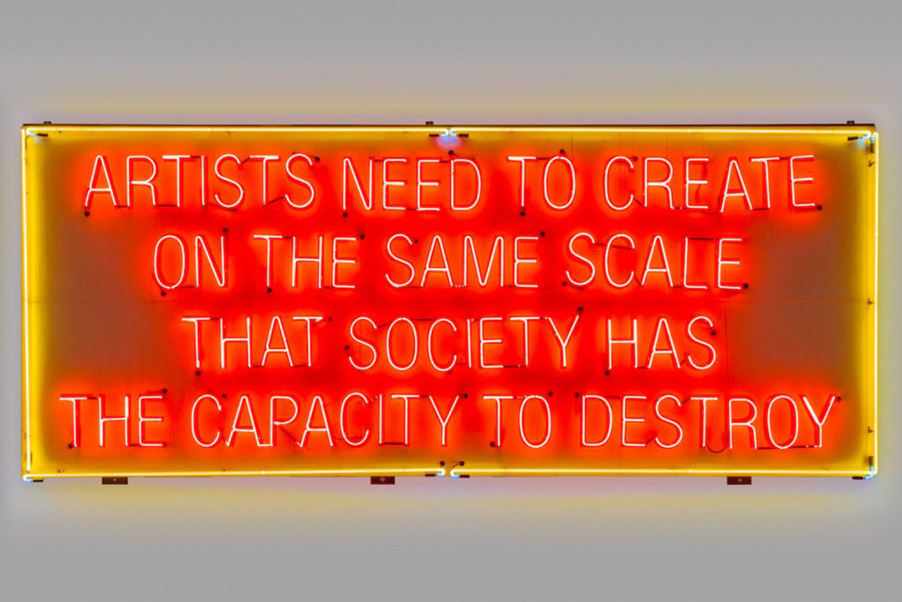 Nel cortile esterno saranno invece visibili l’opera al neon di Lauren Bon che ha ispirato il titolo della mostra, Artists Need to Create on the Same Scale that Society Has the Capacity to Destroy, oltre all’installazione site-specific di Maya Lin, Water Water Everywhere, Not a Drop to Drink e alle performance culinarie di Rirkrit Tiravanija, Tomas Vu e Sarah Sze che verranno ospitate durante i giorni di apertura e chiusura dell’esibizione.