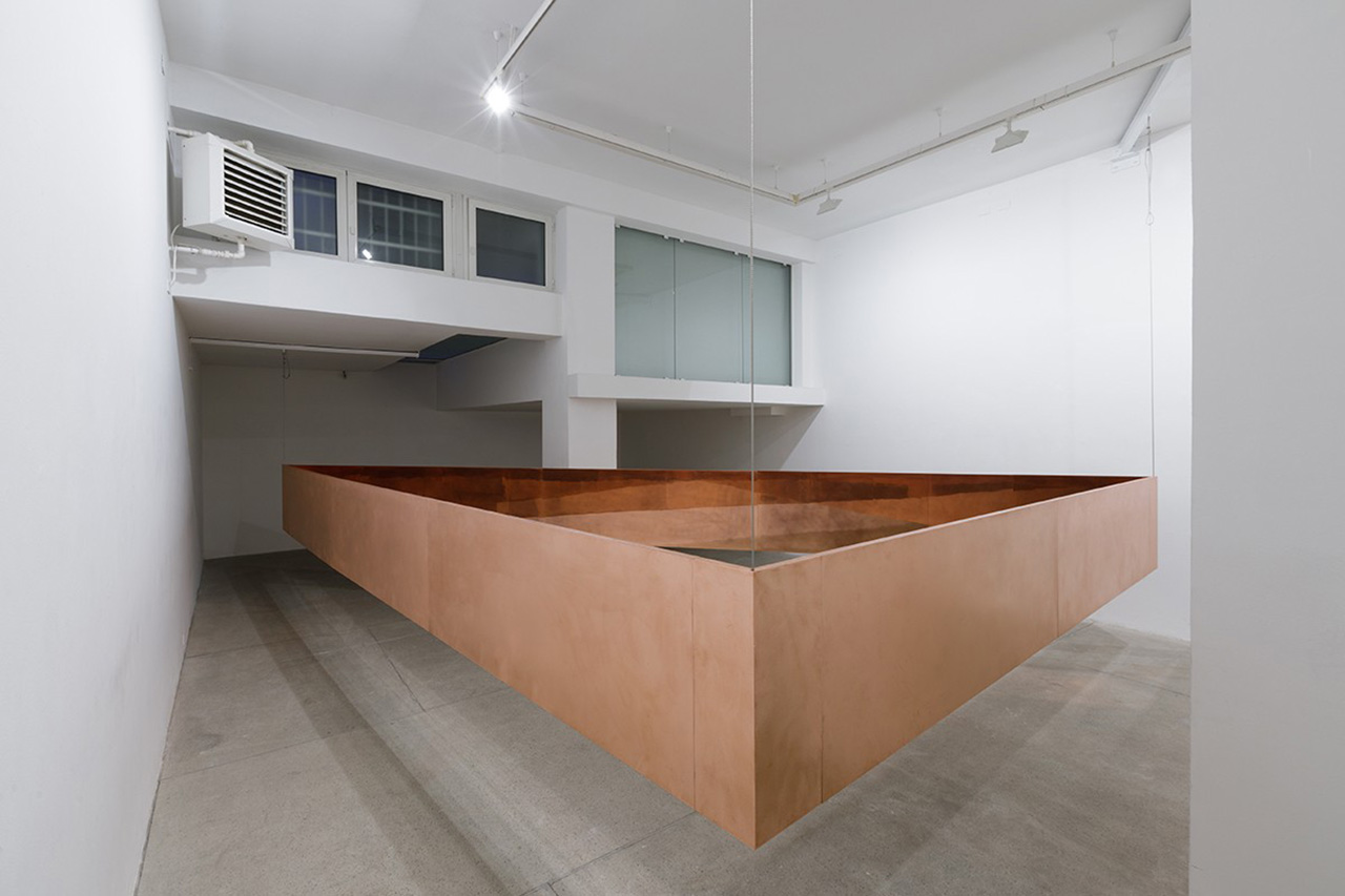 La sua predilezione di trovare corrispondenze tra sequenze numeriche e la coscienza storica di ognuno di noi in rapporto al tempo, si materializza con sculture euclidee di materiali diversi, contenenti riflessioni filosofiche, esperienze personali in tensione tra passato e presente. Il titolo della sua mostra personale, rimanda a quello “Sequenze” per voce composta da Luciano Berio, ed è suddivisa in tre opere distinte, le quali comprendono altrettanti racconti, ognuno declinato in maniera diversa. In via Stradella 7, nello spazio ipogeo, altera la percezione dello spazio Angolo Scontento (Hommage à la mort de Sigmund Freud) una scultura in rame opaco all’esterno e specchiante all’interno, a forma triangolare, cava, sospesa da terra, che perimetra uno spazio e ospita una persona seduta, nata nello stesso anno della morte di Freud (1939), disposta al centro per raccontare se stessa e il suo vissuto. Chissà forse si tratta di una simulazione di seduta analitica però senza lo psicoanalista, in ogni caso sono da osservare gli effetti di riflessione tra dentro e fuori che la scultura in rame genera. Nel triangolo si configura uno spazio di riflessione, dove concettualmente si annulla la distanza temporale tra il passato e il presente, in cui una vita prende forma quando muore Freud nel 1939.