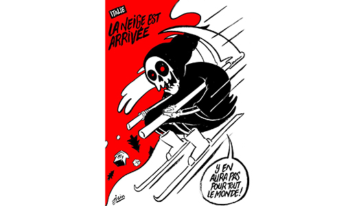 Nelle ultime ore Charlie Hebdo fa scandalo di nuovo perché ritrae la morte sotto le vesti di nera signora a bordo di un paio di sci che scende da una montagna bianca con un cielo rosso sangue sullo sfondo. Ma perché ce la prendiamo tanto? Davvero non abbiamo altri argomenti sulla vicenda se non quello del sentirci offesi, derisi? E tutti a gridare allo scandalo, da Salvini in giù, quando ancora sui media italiani si cercano colpe, tra allarmi sottovalutati e affini. Questa realtà invece non è scandalosa?