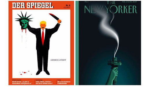 Tanti anni fa in Italia quel gruppetto pop che erano gli 883 cantavano “Hanno ucciso l’uomo ragno”, tormentone giovanilistico di metà anni ’90, di cui però ancora si ricorda il ritornello. Chissà se tra vent’anni, invece, ricorderemo di nuovo le copertine del Der Spiegel, settimanale tedesco, e del New Yorker, corrispettivo della Grande Mela. Perché? Per due copertine che hanno fatto impazzire i social media nelle ultime ore in cui si raffigura la fiaccola spenta della Statua della Libertà, a cui è rimasta in mano solo una scia di fumo (New Yorker) e nell’altra in cui un Donald Trump senza volto con in mano un coltellaccio da Jihadista mostra la testa mozzata del simbolo di New York e dell’accoglienza, in versione “Medusa”.
