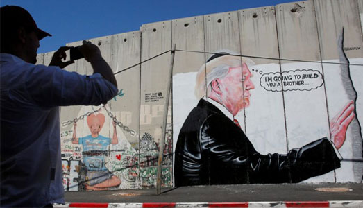 Nell’altro murales, invece, Trump è raffigurato con una kippah ebraica sulla testa mentre appoggia una mano su un muro (nella foto in alto). E una nuvoletta-fumetto ne rivela i foschi pensieri: «Sto per costruirti un fratello…». Se il disegno riprende una foto del presidente a stelle e strisce durante la sua visita, nello scorso maggio, al Muro del pianto di Gerusalemme, il riferimento dell’opera nel suo complesso è, invece, al muro che Trump vuole a ogni costo tra USA e Messico.