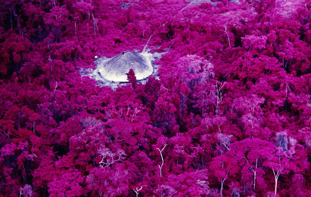 Un luogo magnifico rivelato qui da foto infrarossi, vedi La Foresta (pellicola a infrarossi, Roraima, 1972-76), o La Casa collettiva vicino alla Missione Cattolica sul fiume Catrimani (Roraima, pellicola a infrarossi, 1976). Quest’ultima presenta lo yano, un’abitazione collettiva circolare, abitata dai membri di un’unica entità economica e politica, immersa in una rigogliosa natura, qui restituita da un estraniante rosso magenta. A infrarossi, a colori o in bianco e nero, le foto di Andujar rivelano un’incredibile padronanza tecnica che risolve il problema dell’oscurità in cui è immersa la foresta, oltre ai modi di vita e a pratiche spirituali come lo sciamanesimo. Gli uomini-spiriti, ossia gli xapiri thëpë – indotti in trance dalla polvere allucinogena yãkoana – vengono immortalati da scatti intensi, in cui vediamo lo sciamano Tuxaua João che soffia yãkoana nelle narici di un ragazzo durante la festa reahu (Catrimani, Roraima, 1974), o il giovane Wakatha u thëri, vittima del morbillo, curato dagli sciamani e dagli assistenti della missione cattolica Catrimani (Roraima, 1976). Si tratta di foto in grande formato, porose e oniriche, che colgono gli adepti lungo questo viaggio ‘ultraterreno’.
