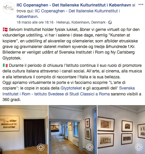 - nell’account Facebook dell’Istituto Italiano di Cultura di Copenaghen un post del 18 marzo offre la possibilità di visitare le sale delle mostra a 360 gradi.
