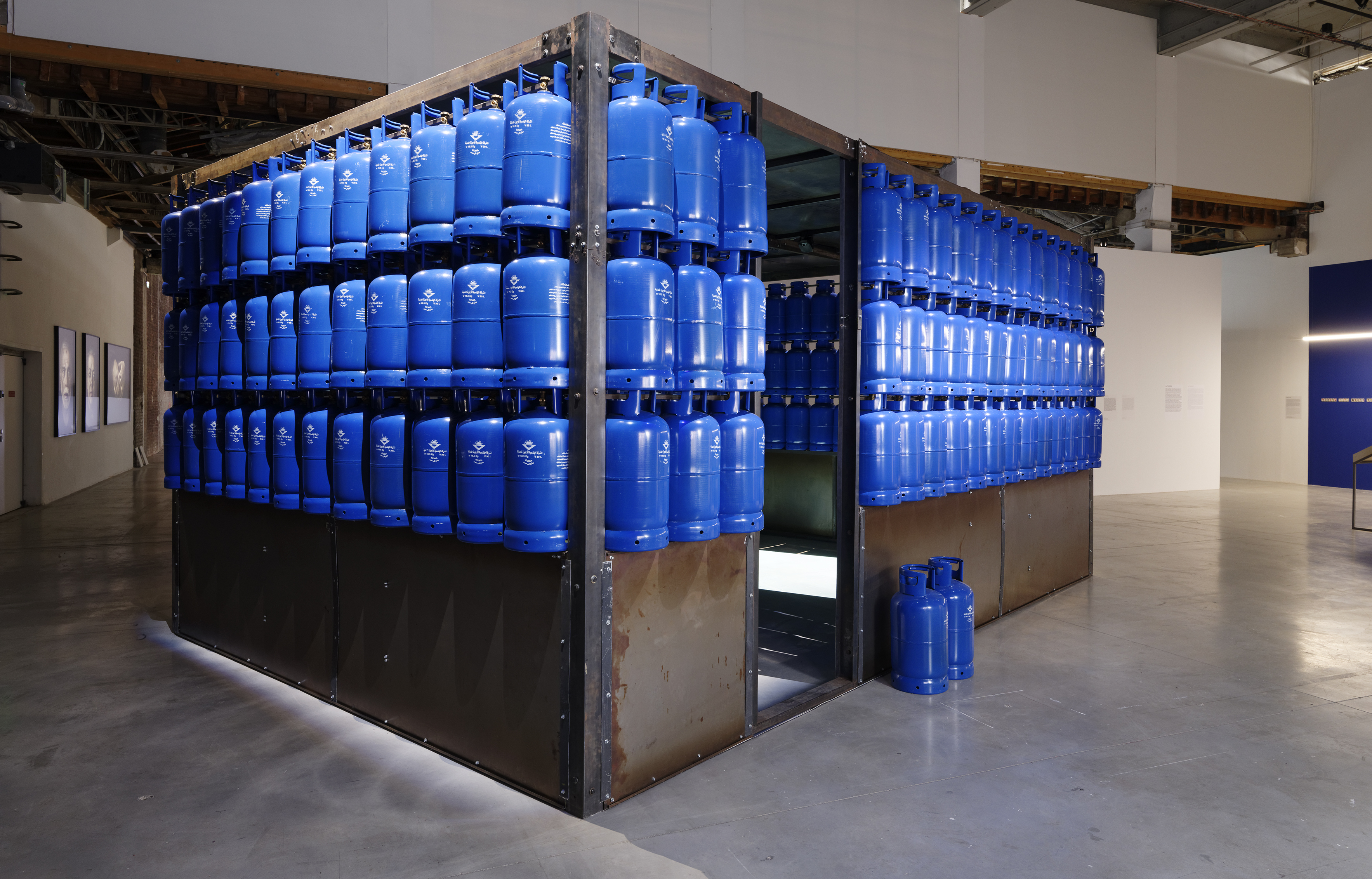 Vi ricordate Silence of the sheep? Una performance controversa di Amal Kenawy (1974-2012), in cui una donna guidava, come una pastorella, una quindicina di uomini che a carponi traversavano le strade del Cairo. Dell’artista egiziana troviamo qui The silent multitudes (acciaio, serbatoi GPL, video, 2010), – la prima opera che trovate all’inizio di questo articolo – un’installazione che sfrutta lo stile architetturale dei quartieri poveri del Cairo, con pareti formate da oltre cento bombole a gas. Simbolo di un pericolo imminente, ci parla dell’urgenza ecologica.