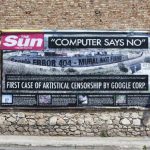 Quindi che ha fatto MTO? Nel recente festival Memorie Urbane che si è tenuto a Gaeta ha realizzato un murales intitolato We Live on Google Earth, dove si legge “Google Error 404 – Mural Not Found”. E ci ha pure disegnato la pagina di un giornale farlocco, datato 20 maggio 2020, dove si legge “Computer Says No” e “First Case of Artistical Censorship By Google Corp”.