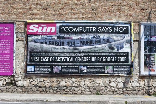 Quindi che ha fatto MTO? Nel recente festival Memorie Urbane che si è tenuto a Gaeta ha realizzato un murales intitolato We Live on Google Earth, dove si legge “Google Error 404 – Mural Not Found”. E ci ha pure disegnato la pagina di un giornale farlocco, datato 20 maggio 2020, dove si legge “Computer Says No” e “First Case of Artistical Censorship By Google Corp”.