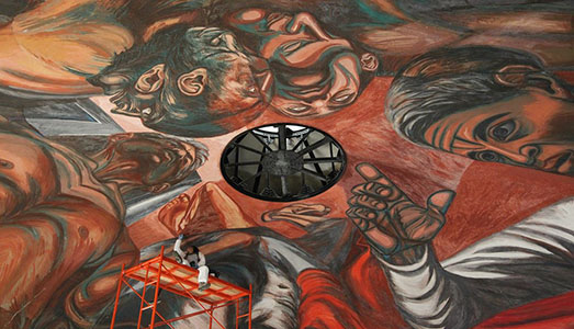 Ma proprio lì doveva farlo il murales? Si saranno detti i restauratori incaricati di riportare al suo stato originario il murales di Josè Clemente Orozco, danneggiato dal terremoto nel 2015.