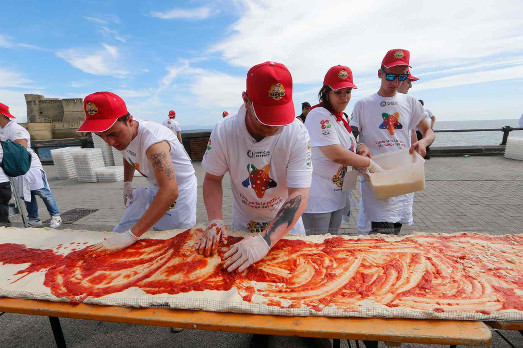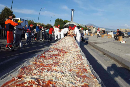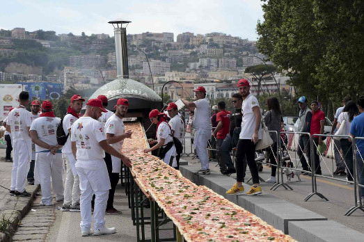 Una recente azione di beneficienza ha sfruttato però la realtà e l’immagine della pizza. È stata realizzata la più grande pizza che si ricordi a memoria d’uomo. Lunga 1,8 chilometri, che ha richiesto 2mila chili di farina e 2mila chili di mozzarella, 1.600 chili di pomodoro, 200 litri d’olio e 30 chili di basilico. E con questi numeri ha sfilato per Napoli. Per poi essere cotta, venduta e mangiata. E il ricavato è andato in beneficienza.