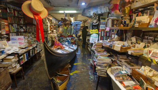 Qui invece una barca simbolo italiana, la gondola, ha fatto prepotentemente il suo ingresso in una libreria. E non è l’installazione di un artista che vede il mondo alla rovescia. È che se la gondola fosse rimasta fuori, avrebbe rischiato una brutta fine. Colpa dell’acqua alta che nei giorni passati ha picchiato duro a Venezia. E quindi, eccola qui, in una libreria. Già di per sé piuttosto zeppa di libri, ma ancora arzilla per accogliere una gondola.