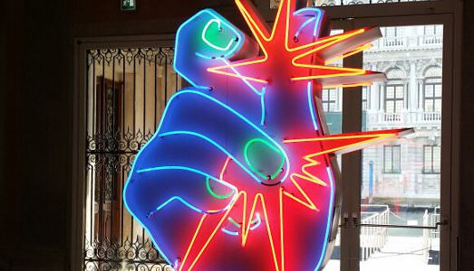 La foto che vedete è dell’opera all’interno del Palazzo su Canal Grande, molte altre le trovate sulla pagina facebook di Exibart. Ha qualcosa che evoca la fiaccola della Statua della Libertà. È insomma un welcome al neon e colorato che ben si attaglia a questo inizio di settimana veneziana. Che non tradirà le aspettative degne di qualunque biennale che si rispetti, annunciandosi parecchio incandescente.