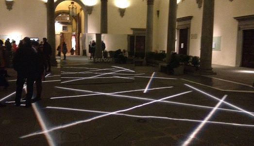 Bianco -Valente ha realizzano appositamente per il cortile di Palazzo Strozzi a Firenze quest’opera site-specific a cura di Elena Magini: una parete specchiante al centro, a dividere in due settori lo spazio, dei raggi luminosi proiettati sul pavimento a disegnare delle losanghe irregolari. Sullo specchio la scritta “Tu sei qui”, come si usa sulle mappe topografiche. L’antico spazio rinascimentale assume immediatamente una dimensione “altra”, la prospettiva sembra modificarsi, le immagini si riflettono e l’ambiente pare dilatarsi. Il consueto luogo di transito, da qualche anno reintegrato nel tessuto cittadino, viene modificato e restituito a coloro che lo attraversano e lo vivono in modo diverso, quasi fosse una realtà nuova. Al centro ci siamo noi. Anzi, tu (che) sei qui. (Enrica Ravenni)