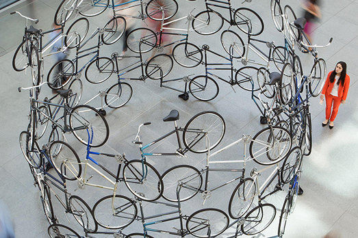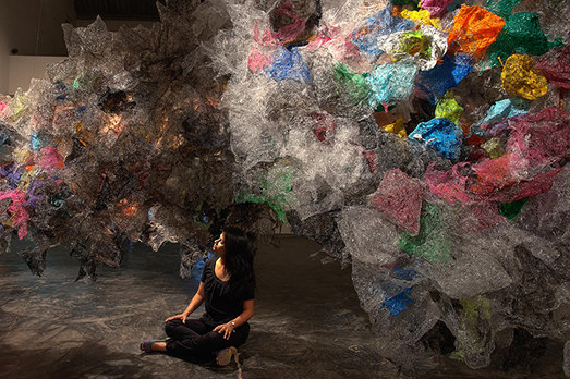 Sono installazioni alquanto impressionanti, che puntano sul numero, la moltiplicazione delle cose e delle persone che è la prima chiave per capire, o solo osservare, l’Asia. Dal più grande e uno dei celebri slum di Mumbai, Dharavi, rifatto da Hema Upadhyay, alle migliaia, milioni di sacchetti di plastica che ogni giorno vengono usati nella più popolosa città indiana proposti da Aaditi Joshi. E oltre l’India, c’è naturalmente la Cina (le torri di biciclette di Ai Wei Wei) e la Corea. E gli artisti che raccontano a loro modo il proprio Paese. Abbiamo scelto l’India, e in particolare Hema Upadhyay, per ricordarla dopo il suo brutale assassinio avvenuto a dicembre dello scorso anno. E ancora irrisolto.