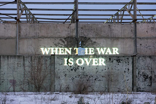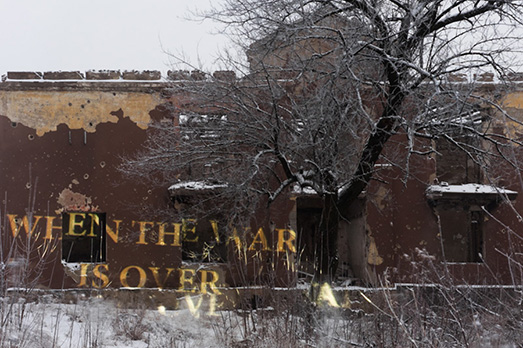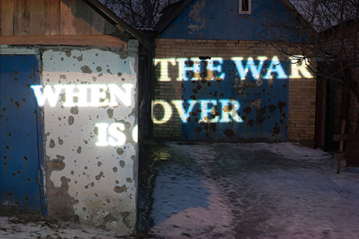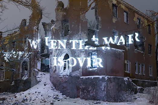 “Quando la guerra è finita”. Queste poche parole, già piene di significato, si arricchiscono di una maggiore potenza quando l’artista ucraino Dmytro Kupriyan sceglie di proiettarle sui palazzi martoriati da due anni di guerra e di scattare delle fotografie molto evocative, che raccontano di un paese distrutto. Di cui si parla troppo poco.