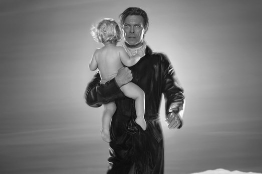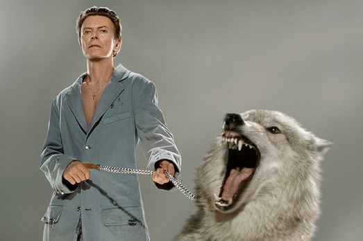 Sembra un po’ l’Hitlerino di Cattelan (Him, vero nome), quello che è stato battuto all’asta da Christie’s due settimane fa per 17 milioni di dollari. Non chiede perdono al mondo David Bowie, in questa foto. Non ne ha motivo. Ma la posizione genuflessa e indifesa ricorda quell’intreccio diabolico di orrore e scioccante arrendevolezza che Cattelan è riuscito a costruire con Him. Altra storia, certo. Ma Bowie in ginocchio, lui che era il Duca Bianco e che era anche molto potente, colpisce l’occhio.