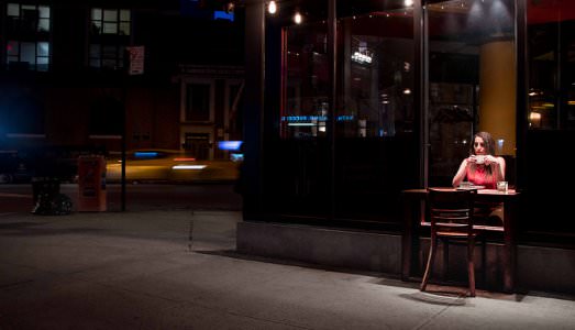 Somiglia un po’ a un quadro di Edward Hopper, stesso spleen di solitudine, tra vite destinate a sfiorarsi ma non a incontrarsi. Stessa malinconia muta. Ma non è detta l’ultima. Basta che il tavolo sia con una parte dentro il locale, il tipico locale notturno dai colori acidi alla Hopper, appunto, e un’altra parte fuori, per strada. Aperto alla possibilità dell’incontro.