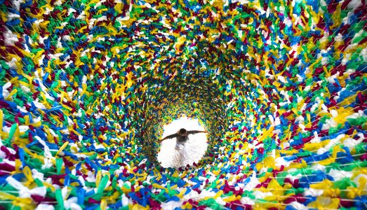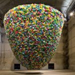Quella che vedete è la realizzazione dell’opera dell’artista camerunense, di stanza a Parigi, Pascale Marthine Tayou, nella fase di lavorazione, alla quale hanno collaborato molti volontari, e poi finita. Un gigantesco cono fatto con il materiale più usato da Tayou: i sacchetti di plastica.