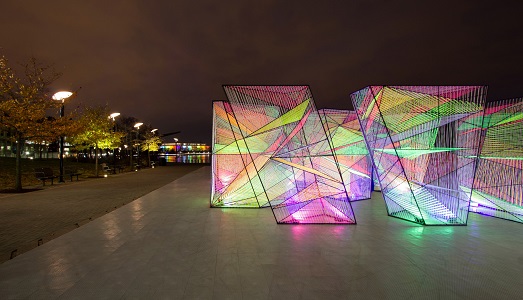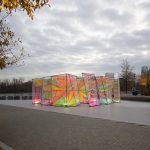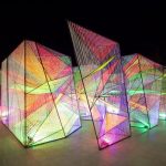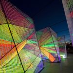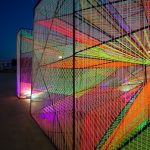 Corde fluorescenti tese all’interno di nove telai di acciaio. Ecco in cosa consiste l’ultimo lavoro creato dallo studio di architettura Hou de Sousa per Washington DC. L’installazione, in mostra al Waterfront Park, è stata pensata per offrire una “caleidoscopica esperienza composta da luce, colore e spazio”: ogni reticolo infatti, che varia per forma e dimensione, produce l’effetto moiré, una distorsione visiva che avviene quando due trame uguali si sovrappongono, e che crea un terzo motivo ondulato. Quando i visitatori guardano o camminano attorno a “Prismatic”, hanno la percezione che le superfici statiche luminose siano in realtà in movimento.