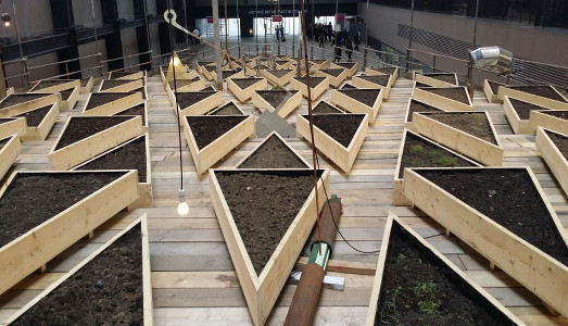 È un progetto strano, “poco Tate”, quello che l’artista messicano Abraham Cruzvillegas ha realizzato per la Turbine Hall della Tate Modern, presentato due giorni fa e che ha inaugurato la prima serie delle Hyundai commissions. Cruzvillegas, che lavora generalmente con materiali trovati, stavolta ha tappezzato la grande area al piano terra del museo, che un tempo ospitava la turbina della centrale elettrica, con piccoli appezzamenti recintati in legno, portando la terra da parchi londinesi, giardini di scuole e di musei. L’elemento naturale, quindi, trasferito dentro il tempio dell’arte. Le aree verdi, o la Waste Land di Eliot, nella città gentrificata.