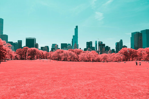 Il risultato eccolo qua. Gli scorci più celebri del grande parco nel cuore di Manatthan si colorano in modo inconsueto. Sembra quasi che il succo di un’arancia rossa o di un altro frutto rosso sia colato sui prati e gli alberi di Central Park.