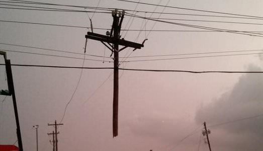 La forza del vento ha spezzato uno dei tipici pali della luce in legno delle strade d’America, lasciandolo sospeso ai cavi elettrici come una croce. “L’ho visto dopo il nubifragio. Dio è con noi”, ha scritto l’autore della fotografia, Chase Rhodes. Può essere, anche se la storia sembra quello di un assaggio di fine del mondo.