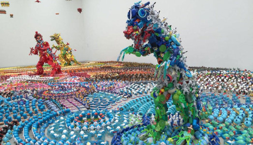 L’immagine che vedete ne è una prova. È un’istallazione realizzata usando 50mila giocattoli riciclati. Una vera trasformazione, alla sua maniera. Ma soprattutto ci piace l’idea che un adulto possa giocare, e a suo modo rilanciare, con i giochi dei bambini.