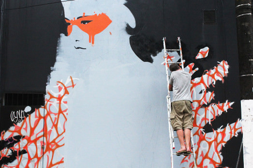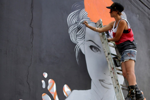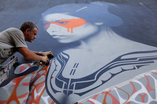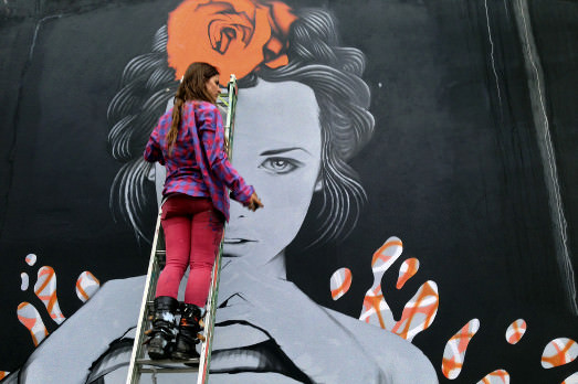 Sì, perché loro lavorano in grande, nel senso di grandi dimensioni, mantenendo un tratto figurativo. E per FIN DAC, che si definisce un artista urbano e stencil non conformista, il disegno è soprattutto quello di una donna orientale. Nelle altre immagini vi facciamo vedere i due a lavoro.