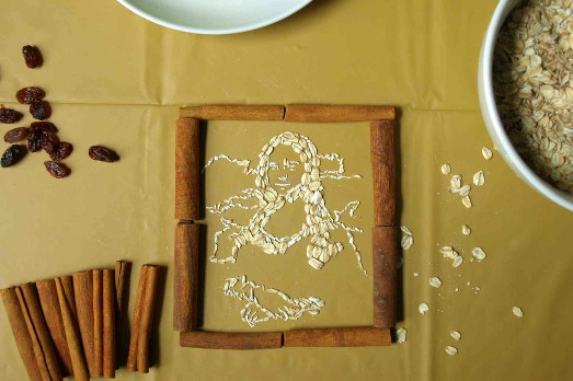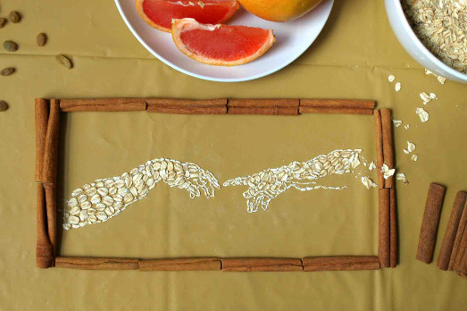 C’è chi alle opere più celebri della storia dell’arte ha messo i baffi, chi li ha rifatte coi pixel e chi col pongo. A questa copiosa lista di remaker, “coveristi” della prima ora, epigoni di Benjamin e della sua riproducibilità dell’opera, allievi di Debord e patiti di détournement, postmoderni non pentiti, si aggiunge Sarah Rosado. Artista autodidatta di casa a New York che ha avuto un’idea semplice ma ficcante. Rifare i vari capolavori di Michelangelo, Vermeer, Leonardo, Van Gogh, Munch, Picasso e Magritte con fiocchi d’avena, frutta e bastoncini di cinnamon. Con gli ingredienti, insomma, di quello che si mette in una ciotola per una sana prima colazione. Senza zucchero, ma nemmeno latte o yogurt.