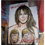 Non è solo Trump a smuovere fantasia e idee degli artisti, anche Hillary fa la sua parte. Lushsux, street artist australiano, che ha già bersagliato la candidata democratica con murales dove la raffigura in combutta con Trump, ne ha dapprima realizzato un ritratto in tenuta da pin up attempata con tanto di mazzetta di dollari sopra l’incavatura della coscia. Riferimento abbastanza palese ai sospetti di traffici che gravano su Mrs. Clinton e al suo incarnare i poteri forti.