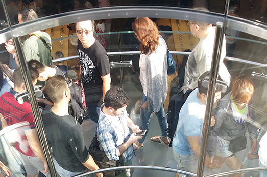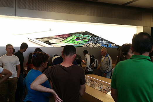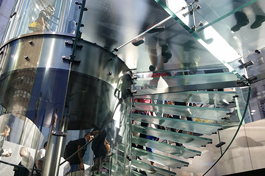 Una porta girevole qualunque? Acqua. Una discesa nel fantastico mondo delle merci, trasparente come si conviene nel consumismo di oggi? Fuochino. È Il white cube del negozio Apple sulla Fifth Avenue di New York è, preso d’assalto per il nuovo Iphone 7.