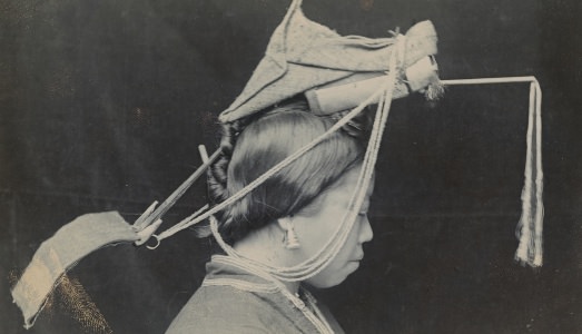 Isabella Bird, inglese, Paese che forse ha sfornato più viaggiatori di qualunque altro, donne comprese a partire dalla mitica Vita Sackwille-West, per molti anni ha soggiornato in Cina e ne ha riportato sorprendenti reportage: popolazioni tribali e lontane, costumi inconsueti, immagine al massimo dell’esotismo con cui sedusse l’Inghilterra vittoriana. Questa foto del 1896 ritrae una donna della tribù dei cosiddetti “musi di cane” che indossa un copricapo per una cerimonia fatto con argento, seta e altri materiali.