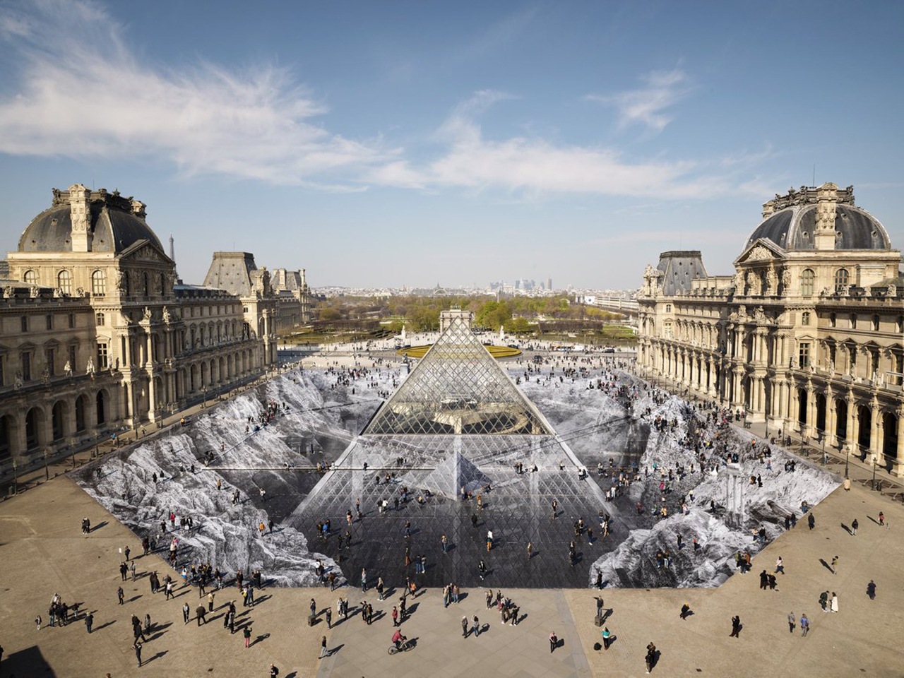 In occasione dei 30 anni della Piramide del Louvre, progettata dall’architetto Ieoh Ming Pei e inaugurata il 29 marzo 1989 , il museo ha chiamato JR a realizzare un’opera monumentale. Con l’aiuto di 400 volontari che per tre giorni hanno incollato circa 2000 strisce di carta intorno alla piramide, l’artista francese ha creato un’enorme illusione ottica che se osservata dall’alto, da l’impressione che la piramide stia emergendo da un abisso.