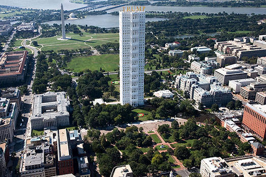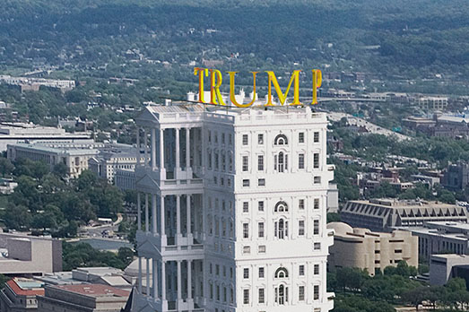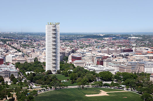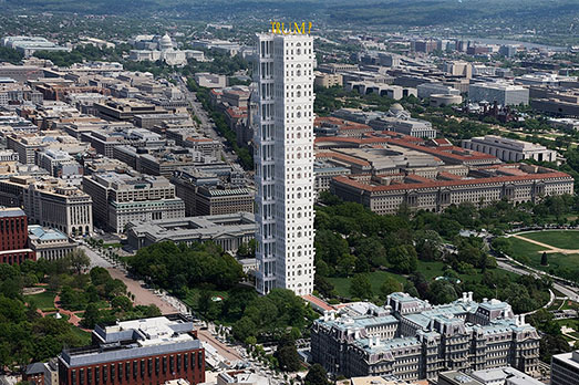Come sarà Washington dopo che Trump si sarà insediato nella Casa Bianca? E come sarà la suddetta Casa Bianca con dentro un inquilino come The Donald? Le domande solleticano non poco gli artisti. Per esempio, il fotografo catalano Victor Enrich ha immaginato una Casa Bianca che si replica per 13 volte in altezza, incoronata dalla grande scritta in oro (c’è bisogno di precisarlo?) a caratteri cubitali TRUMP. Ma non basta. Prima, questa Casa Bianca maggiorata l’ha collocata nel contesto di Washington, così come appare oggi. Poi ha corretto la veduta aerea di Washington dopo la cura Trump. Come appare? Cosparsa di cemento, con al posto dei prati grattacieli e edifici. Gentrificata a dovere, insomma.