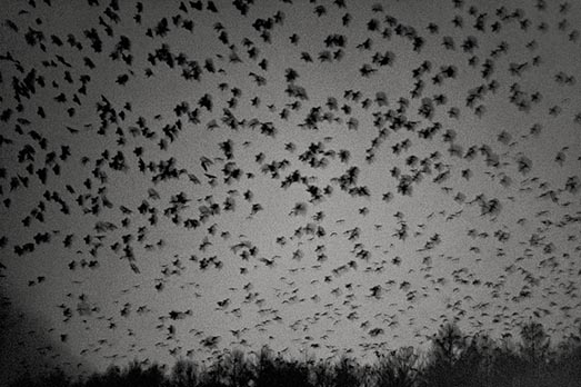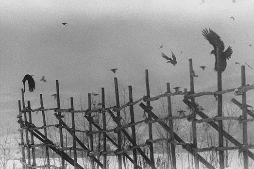 The Solitude of Ravens (Karusu) è un libro del fotografo giapponese Masahisa Fukase pubblicato per la prima volta nel 1984, che raccoglie una serie di immagini misteriose tutte in bianco e nero, dove i protagonisti principali sono stormi di corvi. Nel 1975 Fukase divorziò dalla moglie e durante un viaggio in treno per tornare a Hokkaido, sua città natale, venne ispirato dalla visione di questi uccelli. Così fino al 1982 continuò a scattare foto che riflettevano la sua storia, la fine dell’amore, il senso di solitudine e paura che lo accompagnava costantemente, in un periodo in cui iniziò a soffrire di depressione e avere problemi di alcolismo. Un viaggio scuro, incerto, negli abissi della mente di un uomo tormentato dalla sofferenza, che sembra prendere corpo in visioni sfocate che si susseguono ininterrottamente, come fossero ricordi sgranati.