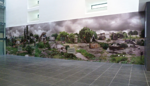 Questa è l’opera permanente, realizzata dal duo torinese Botto e Bruno, che il 27 marzo sarà ufficialmente inaugurata presso la nuova Cittadella della Giustizia di Venezia. È una fotografia lunga circa 24 metri per 2 e mezzo d’altezza. Un landscape ottenuto mettendo insieme immagini di edifici diversi, anche lontani tra loro, mediante il collage. E qui e là, e alla fine molto presente, spunta la natura: cespugli, arbusti, radici. Che gli artisti vedono come un gesto di ribellione, un momento vitale, rispetto alle violenze inflitte sul paesaggio.