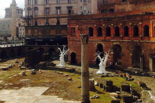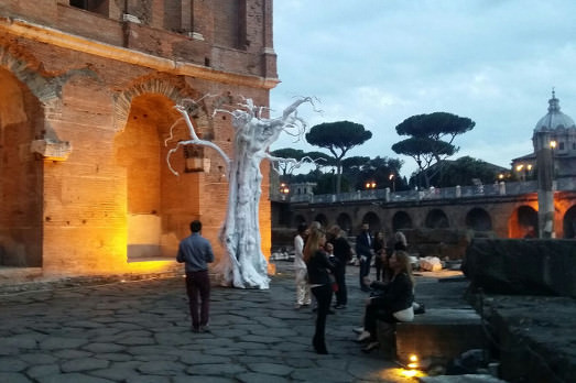 Entri in una specie di cappella laica, scendi molti gradini e molti altri ancora. Poi la vista si apre su uno dei paesaggi urbani più belli del mondo, se non il più bello. Dai mercati Traianei arrivi al Foro. C’è la Basilica Ulpia, il Foro di Cesare, poi più in là quello di Augusto. Forme semicircolari e perfettissime, edifici rosati di mattone, torri stortignaccole che si arrampicano su per un cielo stellato che neanche in Yemen, pietre che raccontano la storia. Poi risali, e dall’alto di una terrazza vedi Roma come non la vivi mai. Unica. Unica al mondo. E maledetta per quanto ce l’hanno negata e maledetti e disgraziati noi che ce la siamo fatta negare. Da qui il suo sfracelo non è neanche un eco lontano. Qui è inverosimilmente bella. Per una sera torna ad essere come dovrebbe, potrebbe essere sempre, solo se se ne capissero le potenzialità.