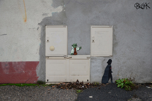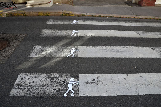 La strada è un’ottima location per fare arte. Non solo lo spazio libero, ma anche le sue imperfezioni, le zone d’ombra, i punti sconnessi, parenti stretti di quelli che Giles Clément chiama terraine vague. E OAKOAK lo dimostra? Chi è OAKOAK (tradotto in italiano quercia quercia)? Uno street artist francese che usa proprio quei punti morti (e strani) che spesso s’incontrano per strada. E lui ci lavora sopra, creando immagini inedite, spesso anche parecchio divertenti, somiglianti come sono a delle strip di cartoon.