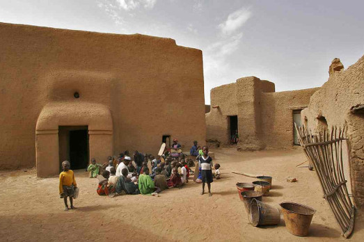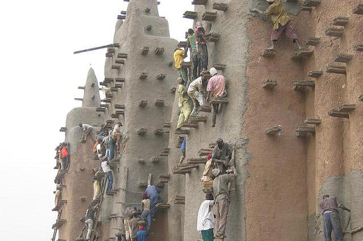 È una moschea, una bellissima moschea ed è la più grande costruzione di fango del mondo. Un’architettura, questa fatta di fango, che si sviluppa in una buona parte del pianeta, quella più povera, ma che in Mali, dove si trova Djenne, la città che vanta appunto questa perla, raggiunge livelli inimmaginabili. Ogni anno la Grande Moschea di Djenne viene seriamente danneggiata dalle piogge e ogni anno i suoi abitanti la ricostruiscono. Da secoli, quindi, la moschea di Djenne è il prototipo di un’architettura corale, quella pratica partecipata che oggi si chiama arte relazionale. Ma qui non ci sono curatori di grido e innovativi progetti d’inclusione sociale. Nasce tutto spontaneamente, è una tradizione e una vita che scorrono così da secoli.